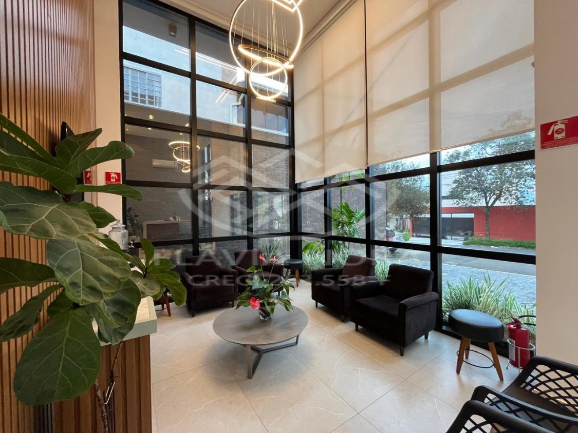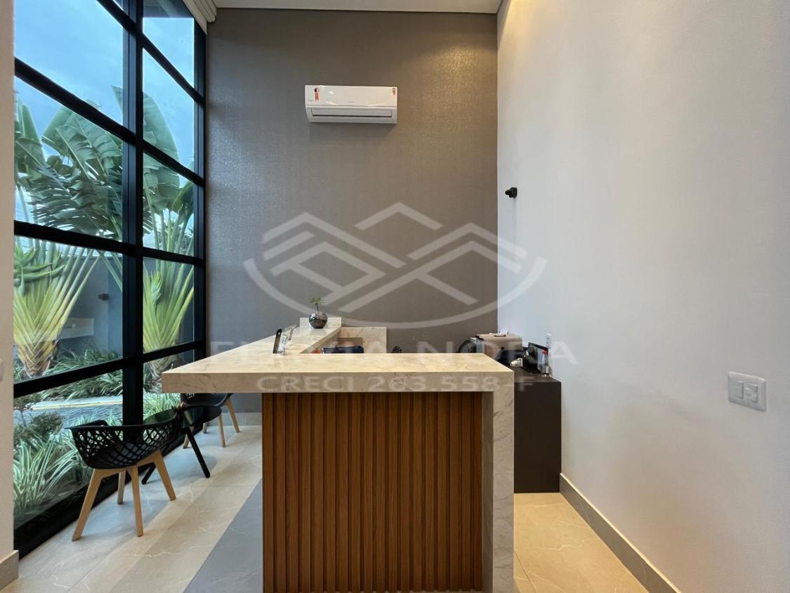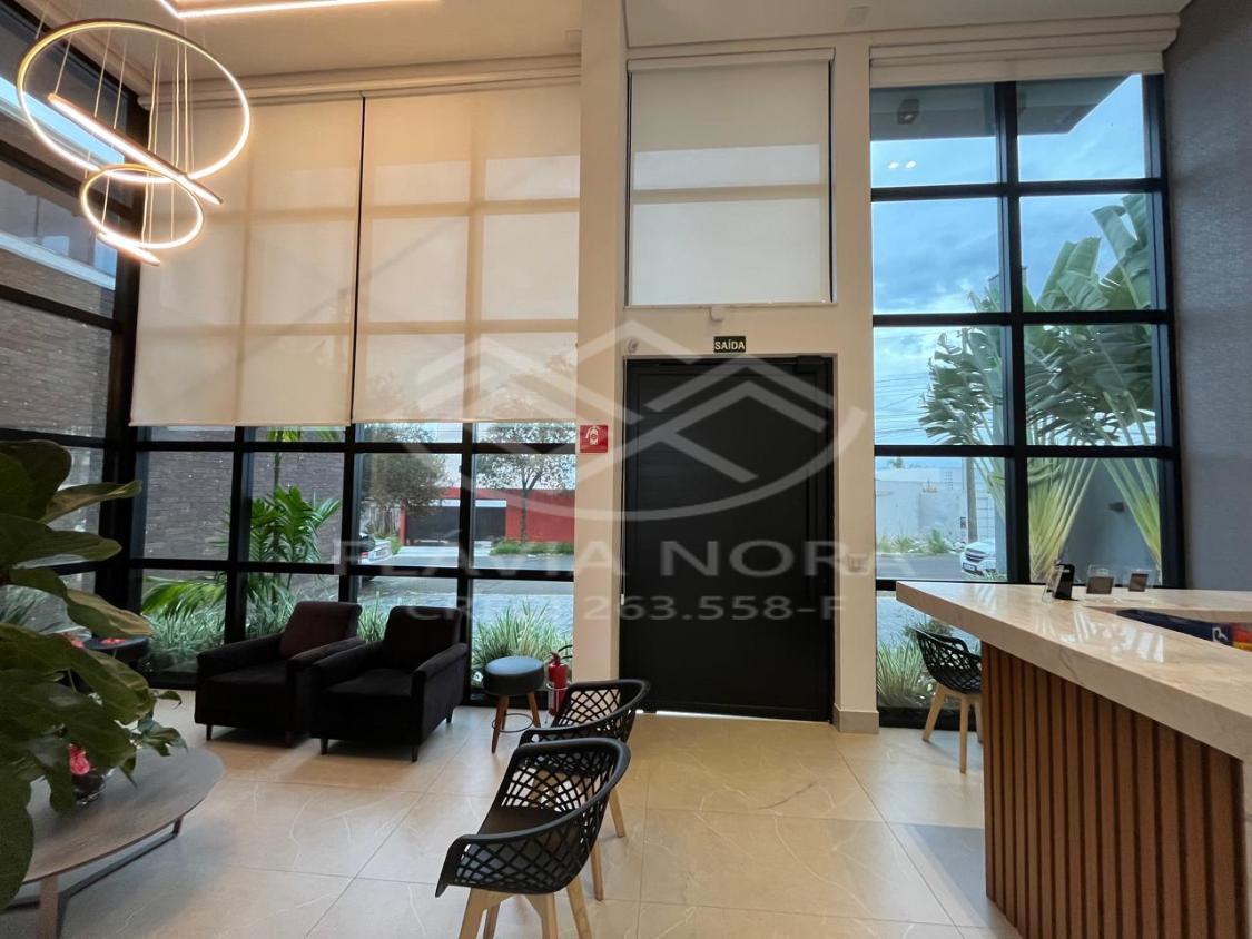 Prédio novo, térreo, com recepção e sala de espera moderna, com móveis nas áreas comuns e ar-condicionado.